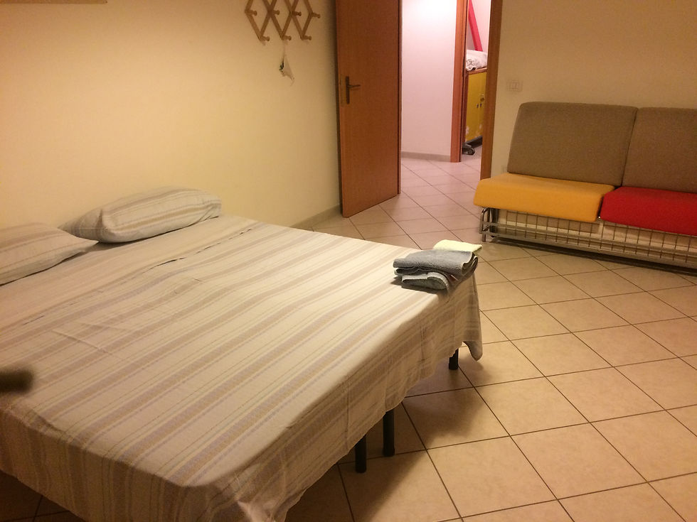 Camera matrimoniale arredata, anche uso quadrupla, arredata con divano letto singolo letto matrimonale, dotata di finestra e bagno adiacente privato con vasca.
